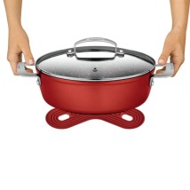 Como incorpora 3 puntos de imán, permite que se enganche a las cacerolas, paelleras y demás piezas, solamente acercando la base de éstas al salvamanteles. Llevándote la cacerola directamente a la mesa proteges el mantel del calor.