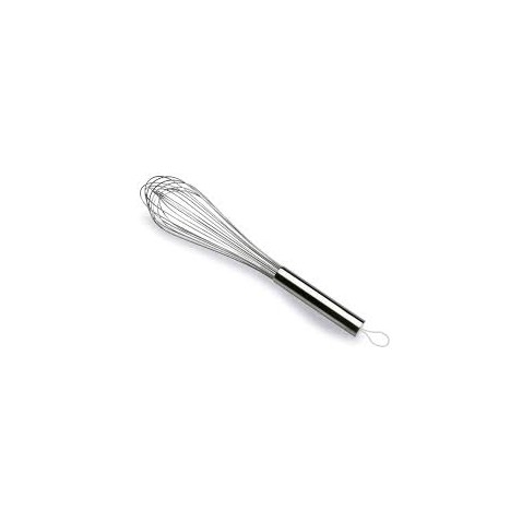 Batidor manual profesional de acero inoxidable (35 cm) con sistema de 12 varillas. Ideal para preparar alioli casero, mezclar caldos sin grumos o batir grandes cantidades. Muy robusto, no se deforma y garantiza una mezcla rápida con menos esfuerzo.
