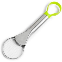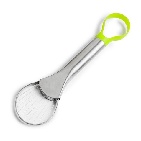 - Corte limpio y uniforme: Tanto el cuerpo como el hilo laminador son de acero inoxidable. Esto te permite cortar y vaciar la carne del aguacate en lonchas finas de una sola pasada, logrando una presentación mucho más cuidada.