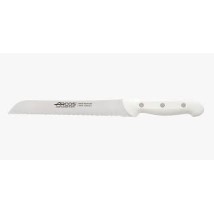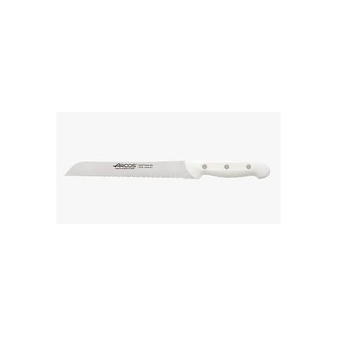 Cuchillo panero de 210 mm con hoja dentada y mango blanco. La herramienta ideal para cortar rebanadas perfectas de pan rústico o de pueblo sin aplastar la miga, el acompañamiento indispensable en tu mesa.