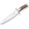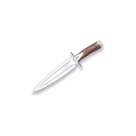 El Joker Colmillo es un cuchillo de remate ágil y contundente. Su hoja de 21,5 cm de doble filo y su puño de ciervo auténtico ofrecen un manejo preciso y un agarre natural, garantizando un remate limpio y seguro en cualquier situación de montería.