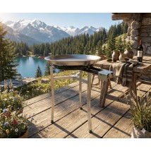 Conjunto compuesto de paellera de acero pulido, paellero alta gama y patas largas para terraza o jardín.