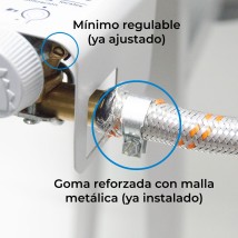 El pack incorpora un regulador de gas con válvula de seguridad por exceso de caudal, que interrumpe automáticamente el suministro en caso de consumo anómalo, como una rotura de la goma o un fallo grave en la instalación. Todo el conjunto cumple la normativa UNE EN 12864, aportando una protección adicional durante el uso.