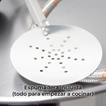 Las patas reforzadas y regulables permiten adaptar el paellero a cualquier superficie, consiguiendo una base estable incluso en exteriores. Además, la espumadera incluida hace que este pack esté realmente completo: con este conjunto ya tienes todo lo necesario para empezar a cocinar tu paella, solo faltan los ingredientes.